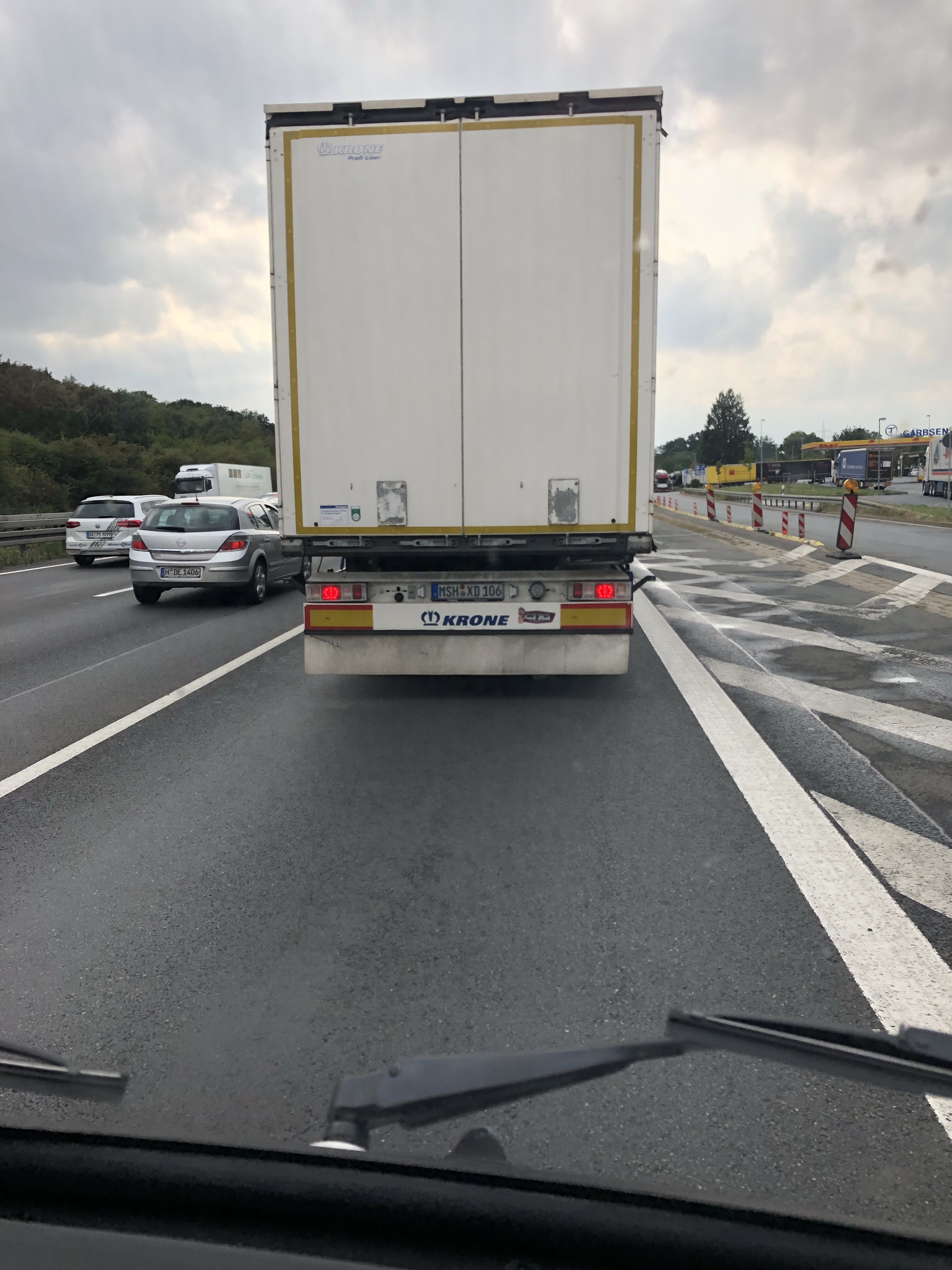 Even with this discovery below (photo taken when we were stationary obvs) that Krone trucks – you’ll have to zoom – have special crown (Krone) brake lights 😍, we still struggled with boredom.
